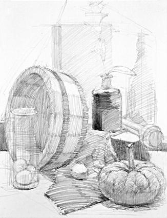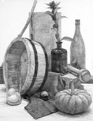 ●制作プロセス 鉛筆・静物デッサン 「竜胆・桶・南京 etc」