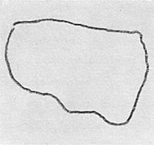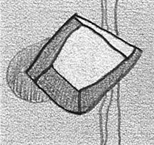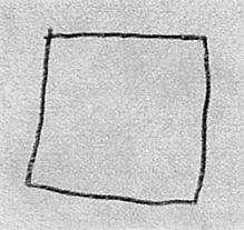 積み木の立方体はスケッチブックの向こう側、作者の眼から40〜50cm程度隔てて、三面が見えるように机上に置かれている。三つの面が見えているにもかかわらず、一面の特徴(正方形)のみ描いてしまう。そこでちょっと悪戯に「こっちの面は無いの?」と声を掛けてみたらこのような結果になった。よく見ると、側面の稜線一つが描かれようとしていたのが判る。しかし、側面に気付きはしたもの絵の中でそれらが実現できず、混乱したなかで打った手が四角周辺に鉛筆の跡として残った。