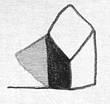 まっすぐな稜線はまっすぐに。斜めに見えれば角度をつけて。四角形なら四角に。そして、垂直に立つ稜線は絵の中でも垂直に。明るい面と暗い面。机上に落とした影。これで完璧と、意気込んで描いている最中に、「机の上に置いてあるよね」と、口をはさむと、最後に左下に見える水平線が付け加えられた。絵というものは便利な手段だ。それにしても、この絵を見て「四角い立体」であることはおおよそ見当がつく。立体を対象としながら平面図形としかならなかったものが基面(台)を意識すると、そこに立つモノが現れる。モノとは勿論、形態。立体なのである。