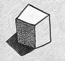光が当たった面は明るく、陰の面は暗い。では、明るい面は白く、暗い面は黒いと言えるだろうか。上の例は、黒く塗装された艶のある立方体を仮定して、やや上方から見た状況の絵である。光源は上方やや左手前。この状況で一番明るい面は立方体上面である。しかし、表面色が黒なので、他の2面に較べてこの面を一番黒く表す方が自然である。物体の表面は、光を受けた方が色・質・面方向・位置が、陰側よりも鮮明となる。日常では当たり前なのだが、白い用紙に黒い素材の鉛筆で描くデッサンでは、ついつい明るい面を白っぽいままで済ませてしまう。