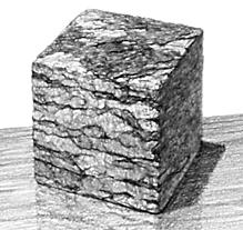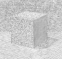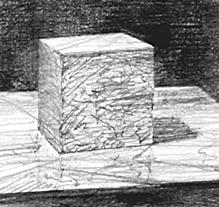 使用する鉛筆の硬さを”H”に限定し、立方体の3面と背景と台(明るいところと影部分の2種)を、明度差をなるべく付けずに鉛筆の筆跡(タッチ)を変化させて描く。上と同様、実物を見ずに描く。立方体の明るい正面は粒子状の跡。上面はそれより横長の点で密に描く。暗い側面(陰面)は隙間なく強く塗りつぶす。背景は正面に似た粒子状の跡を少し柔らかくぼかす。台面は面方向を考慮してパースに則ってクロスハッチングを効かす。台上の影部分は明部分のタッチと立方体上面のタッチの混合である。陰面と影面は他に比較して同じように少し暗いが、両者のタッチは明確に違う。想像による実物の在り方を手掛かりにして、状況の中での各面の方向差や位置を考え、タッチをシンクロさせる。
