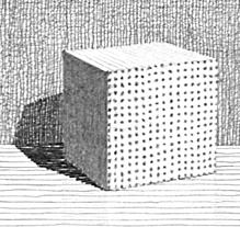 「タッチ」とは、用紙に着けた鉛筆の痕跡。「調子」とは対象物が意図した状態に見えるような相互のタッチの響き合い。例えば、「調子外れ(調子っぱずれ)」といえば正しい音律・音階に合っていないことを指すように、「立方体が台上にある」という見え方に相互のタッチが合っていなければ、”調子が合っていない”ということになる。いろいろな音楽があるように、いろいろな絵のスタイルがある。写実的表現に限定しても人それぞれの表し方がある。上の絵では、立方体正面に規則的な点を並べて打つと、他の面、台、背景、陰影などはどのようなタッチにすると調子が合うのか・・・明度差も考慮に入れて大胆に差をつけてみた。