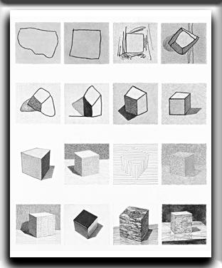 これは、実物を見て描いているのではなく、台上に在る立方体を想定して、画面と平行に一定の間隔で切っていったときに現れる切断図形を、描き連ねたものである。不思議なことに、1本1本の線が合わさると、全体として立体的な立方体に見えてくる。想像上でモノを切るということは、視覚的に見えている範囲を超えて立体としての形態やボリュームの把握が可能になる。さらに、明るい面も白く残したのとは異なり、平らな面としての抵抗感が現れる。見て真似て用紙上に再現するというモノ側からの指令に忠実に従う段階から、作者側がモノに切り込みを入れその反応を活かすという、絵とは描く側の主体的行為であるということを実感し始める。
