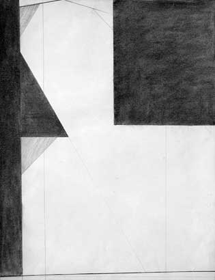 前後左右に傾斜させない画面の設定。水平・垂直の辺に囲まれた枠。その中に納まる石膏像の要所を直線で結ぶ。基準は水平と垂直の直交する二辺。引かれた斜めの直線は直交する二辺と共に直角三角形を導く。そうすることで要所を結ぶ直線の角度が正確さを増す。
