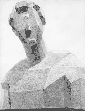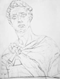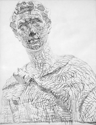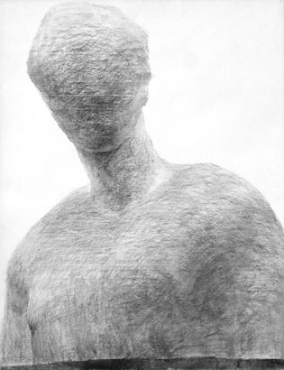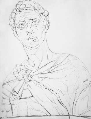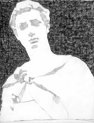 少し気味悪い絵ではあるが、意図的に明るい面に強いタッチを載せ、陰部分にはぼんやりとした調子を充てている。石膏像は白色なので、明部は白っぽい方が理に適っているのだが、デッサンとして立体的に表す際は、光を受けた明部の方を描き起こすのがコツと言える。
