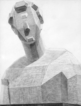 教材としての面取り石膏像がある。それに習って実物を多面体として想像することで、それぞれの面の方向が見定めやすくなる。さらに、光源から降り注ぐ光に対して、各面の明度差が読み取りやすくなる。何処で曲げるかは、面数を少なくして特徴を捉える姿勢が大切。